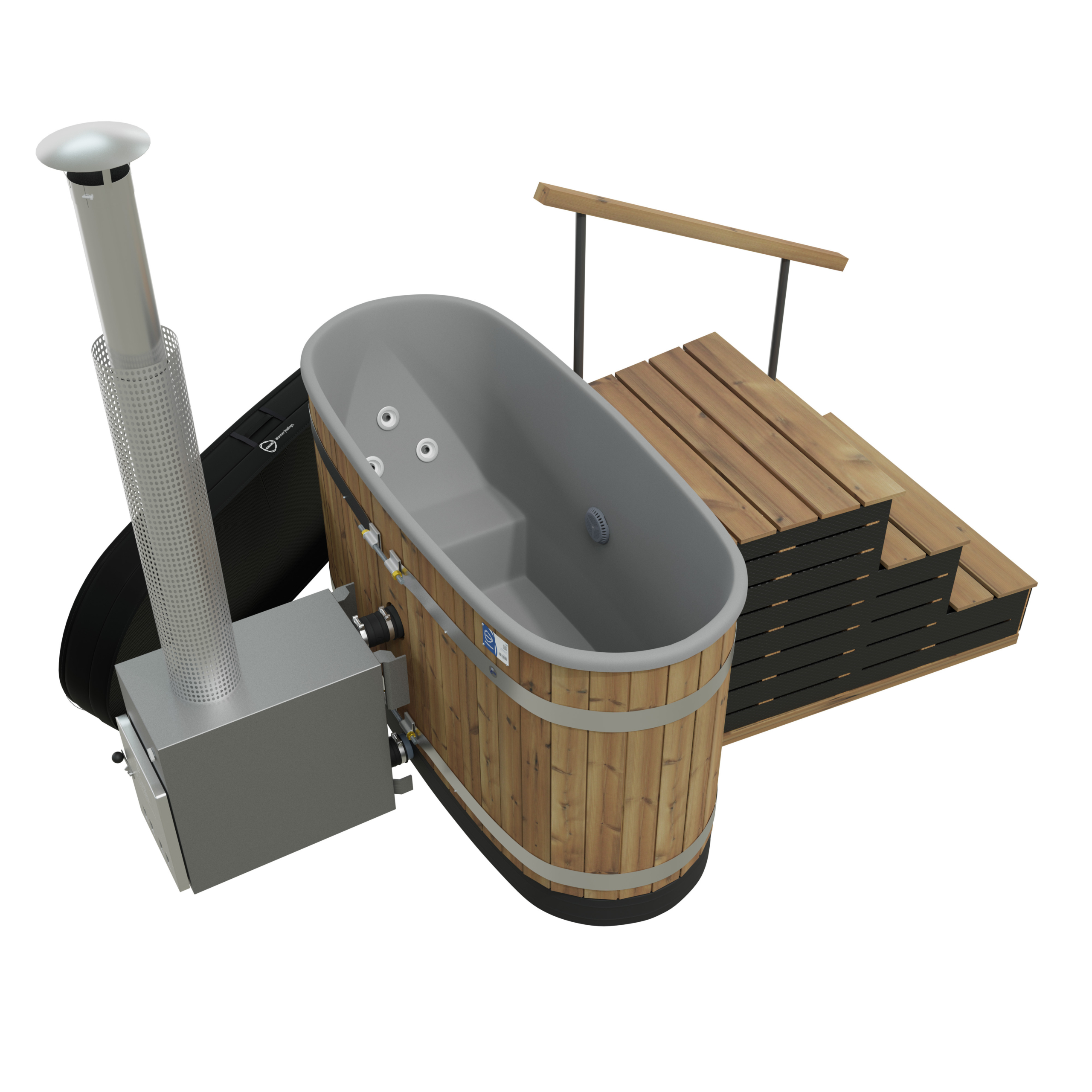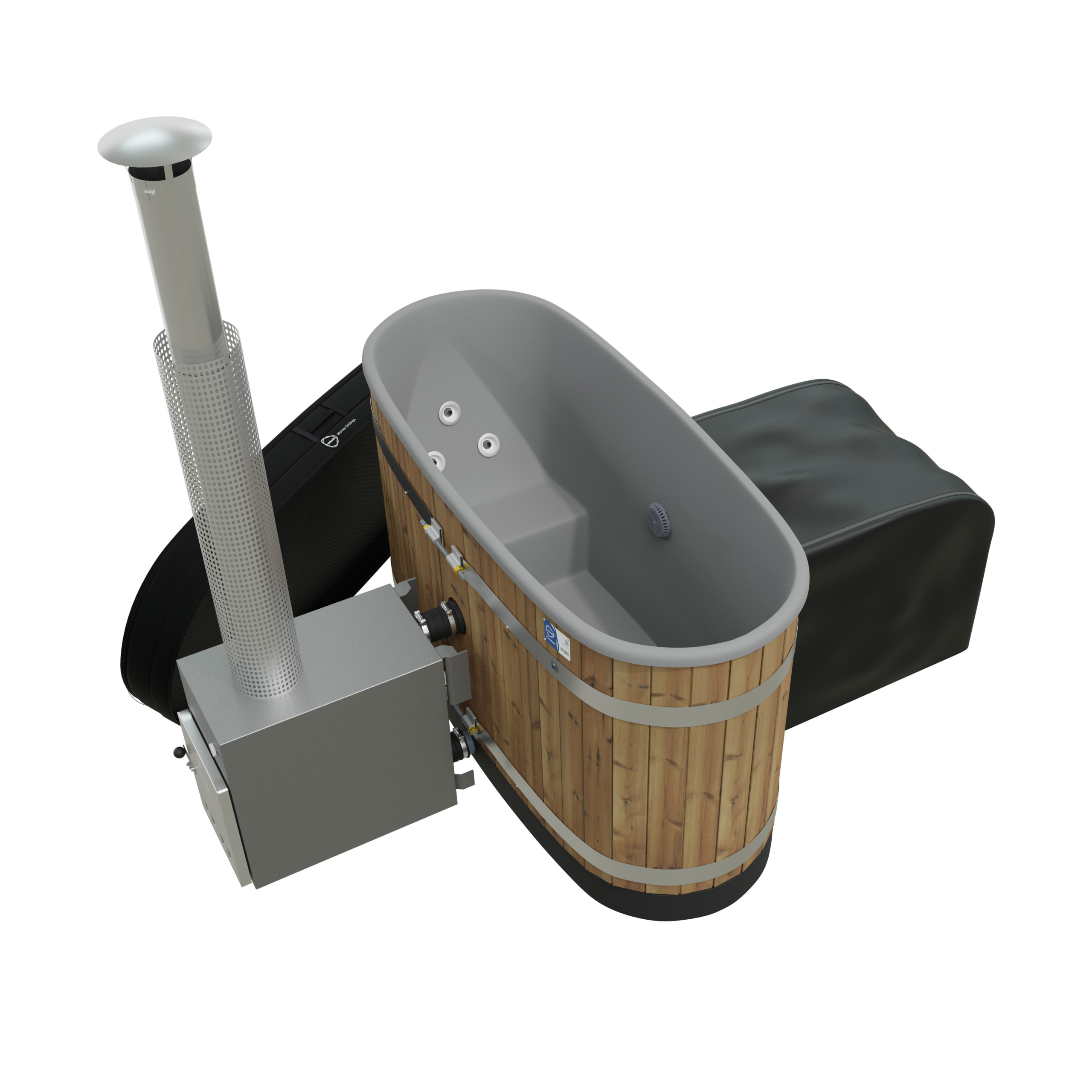 Il est possible d’avoir une chauffe hybride en ajoutant le poêle à bois CULT, d’une puissance nette de 22kW , et gagner en temps de chauffe en utilisant des bûches de 50cm, toutes les 20-30 minutes pendant 1h-1h30. Et votre bain est prêt avec une eau à 38-39°C.