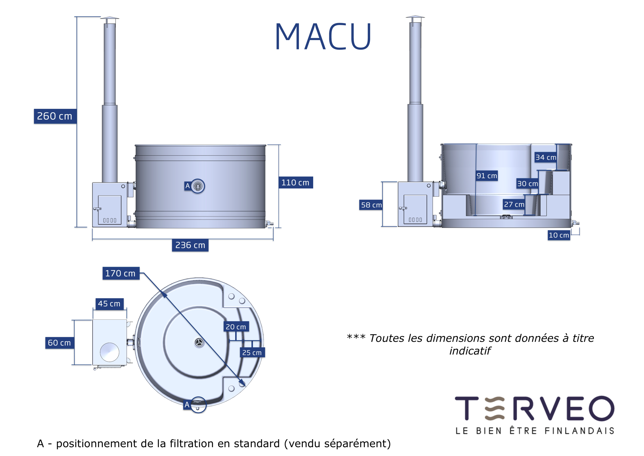 Poids 170 kg Dimensions 170 × 170 × 110 cm Capacités Matériaux d'habillage Cèdre rouge, Composite – Mocca, Composite – Nuit Noire, Thermowood, Epicéa Teinté – Coalblack